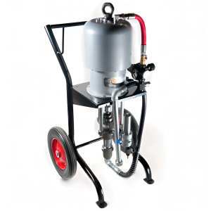 Мощный поршневой окрасочный агрегат, работающий от сжатого воздуха (компрессора или пневмосети). Предназначен для промышленного нанесения ЛКМ на металлоконструкции, вагоны, мостовые пролеты, суда, высотные здания и другие крупные объекты. Эффективен при антикоррозийной обработке и нанесении цинконаполненных составов. Поддерживает работу с водными и сольвентными красками высокой вязкости, возможна одновременная работа до 3–4 малярных постов.